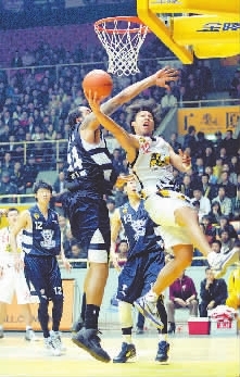 3月30日,东莞马可波罗队球员西姆斯(前左)在比赛中防守浙江明凯照明队球员林志杰(前右)。当日,在2010-2011赛季中国男子篮球职业联赛(CBA)季后赛首轮第四回合比赛中,东莞队客场以97比89战胜浙江明凯照明队,以3比1的总比分晋级半决赛。 新华社记者 韩传号 摄