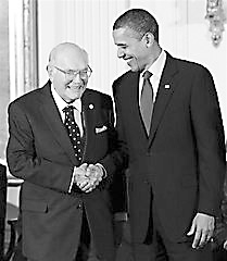 2010年,美国总统奥巴马为库弗(左)颁发国家创新科技奖章。肖捷 供图