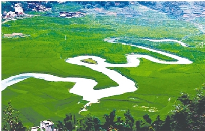 到了巴马,有一处不能不游,那就是巴马寿源的标志——命河。命河在那社乡田垌里七弯八拐,从高处俯视方知其妙,其形态酷似草书的“命”字。因而称为“命河”,长命之河,寿命之河。命河是盘阳河源头之一,民间流传:巴马天然“命水图”是寿星仙翁见证巴马长寿之乡的天宝印鉴。到景区“水晶宫”游览的途中,登上高山专有一凉亭供人俯视观望,此时“命水图”尽收眼底。