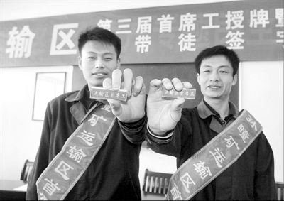 4月4日,淮北矿业孙疃煤矿运输区“首席钉道工”张勇(右)和工友高兴的向来宾展示获得的首席工牌。该矿将技术好、安全意识强、群众威信高、工作业绩好、“传帮带”效果好的职工选拔为“首席工”,每月增加10%到30%的效益工资,并享受每月50元到100元不等的“首席工”特殊津贴,提高了职工争当“首席工”的积极性。 王亮 摄