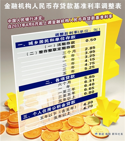 本报北京4月5日电(记者董沛)中国人民银行今天傍晚发布公告,决定自2011年4月6日起上调金融机构人民币存贷款基准利率。金融机构一年期存贷款基准利率分别上调0.25个百分点,其他各档次存贷款基准利率及个人住房公积金贷款利率相应调整。