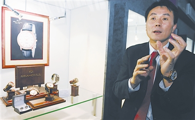 3月30日,在第39届巴塞尔国际钟表珠宝展上,中国天津海鸥手表集团公司总经理吕军讲述自主研发陀飞轮不锈钢袖扣过程。
