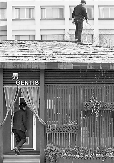 3月29日下午3时许,西安钟鼓楼广场的环保公厕上,张师傅正在给屋顶的绿地浇水。张师傅说,随着气温回升,将不定期对屋顶绿化浇水。据介绍,环保公厕屋顶种植的是佛甲草,既可以在夏季降低公厕内的温度,也增加了绿地面积,全方位地打造生态、环保公厕。