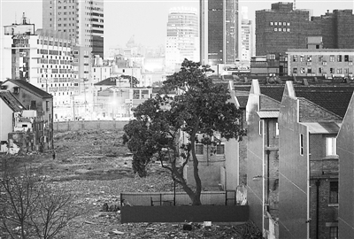 3月29日,基本拆迁完毕的上海地铁12号线南京西路站工地中,一棵百年广玉兰树矗立在蓝色的保护围栏中。据介绍,为了保护这棵百年古树,地铁施工方将南京西路站部分向东移动。