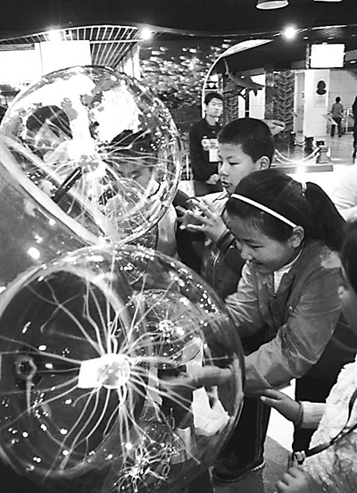 4月5日,小朋友们在山东省科技馆体验科普实验仪器。山东省科技馆自1月7日开始对未成年人免费开放以来,参观人数明显上升。据悉,此次清明节小长假期间山东省科技馆接待参观者15000余人次。新华社记者 范长国 摄