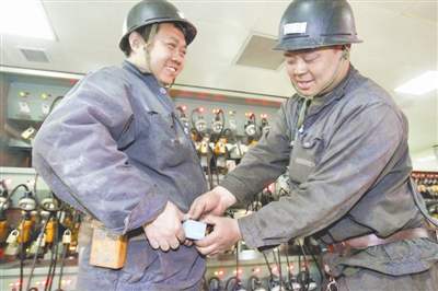 ▶日前,两名矿工在下井前相互检查新配备的矿工井下数字定位系统。