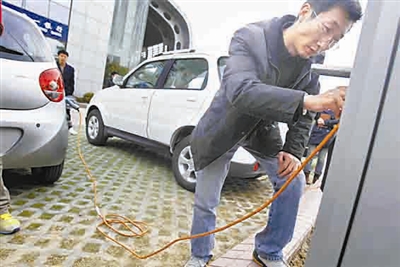 4月6日,上海,购入新车的电动车车主为电动车模拟充电。