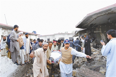 7日,人们从巴基斯坦西南部奎达市一处爆炸现场抬出一具遇难者遗体。当日,奎达市发生一起自杀式爆炸袭击,已造成1人丧生,9人受伤。新华社发(伊克巴尔·侯赛因 摄)