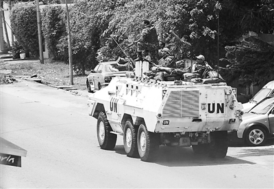 4月6日,在科特迪瓦经济首都阿比让,联合国维和车辆在街头巡逻。新华社记者 丁海涛 摄