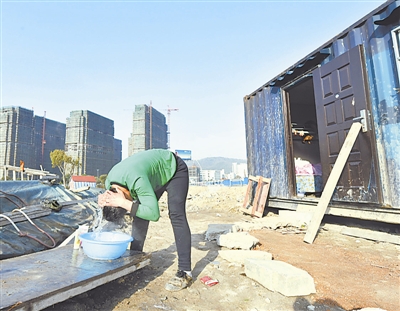 农民工在“家”门口洗漱。这里用水困难,洗脸洗头就一盆水。