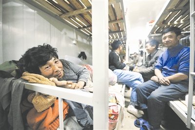这些集装箱板房就像一个个巨大的“柜子”,“柜子”里很潮湿,没有取暖设备。每个集装箱里放置了9张双层铁架床,可住下18个农民工。床与床之间的过道不足半米,农民工们弓着身子在其中穿行,和那些潮湿闷热的味道一起诠释着“柜族”的生活状态。