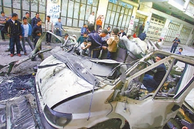 4月9日,以色列空军继续出动战机对加沙地带巴勒斯坦伊斯兰抵抗运动(哈马斯)目标进行轰炸。连日来,以军针对哈马斯的军事打击已经造成18名巴勒斯坦人死亡。图为加沙地区民众围在被炸毁的汽车旁。肖劼 供图