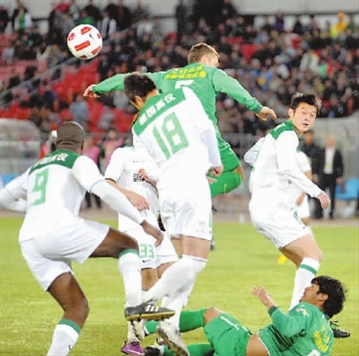 图为2011中超联赛第二轮北京国安主场对杭州绿城比赛中的混战场面。