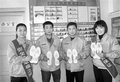 4月8日,河南煤化集团鹤煤三矿女工委组织协安员来到采一队开展“寄心语、嘱安全”活动, 她们将自制的绣有“平安是福”、“情系安全”、“安全是福”等字样的鞋垫送到职工手中,叮嘱他们按章作业,安全生产。姜世军 秦鹤芬摄
