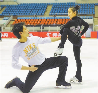 4月11日,隋文静(右)与韩聪正在进行冰上训练。