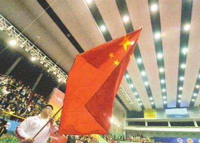 4月12日,中国代表团成员手举国旗走进开幕式现场。