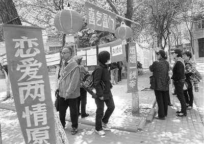 4月10日,武汉,7位退休职工组织的“相亲街”现场。2007年,67岁的沙洋平湖监狱办退休职工孔祥云与附近另外6位退休伙伴,在汉阳琴断口街七里一村办起了“相亲街”,既方便单身男女联谊交友,也让自己的退休生活丰富起来。4年里,共有1843名单身者前来登记,配对402对,成功120对。