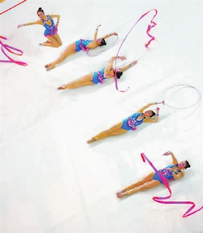 4月13日,四川队运动员在比赛中。当日,在贵阳进行的全国艺术体操集体锦标赛中,四川队获得成年3带2圈球项目冠军。