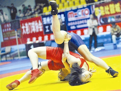 4月14日,山东队选手颜文娟(左)在比赛中。当日,在天津市大港体育馆举行的2011年全国女子摔跤锦标赛51公斤级决赛中,颜文娟以1比2不敌辽宁队选手李爽,获得亚军。 新华社记者 岳月伟 摄