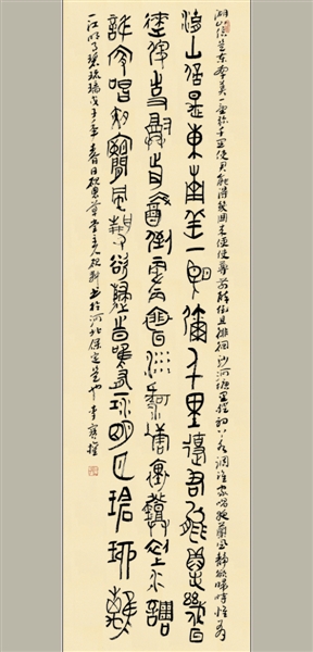 “篆尚婉而通”。宝权篆书行笔劲健,气酣力足。意态端严中不乏飞腾之势,可见其多年研读三代铜器铭文神追古人的心路历程。“隶欲精而密”。其隶书则运笔悠然从容,横鳞竖勒,笔笔不苟,因掌握了“逆入——涩行——紧收”的笔法要妙,笔势活泼轻灵而不失凝重遒劲,笔画柔中寓刚,意气深厚,朴拙中透着秀丽,不故作新姿异态,得自然清整之美。通观之则在气势雄浑壮阔中漾溢着古朴的金石气息。