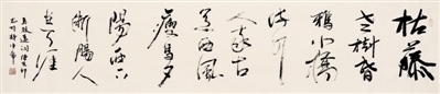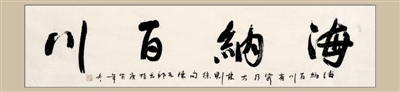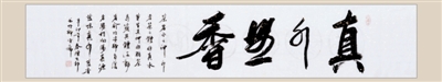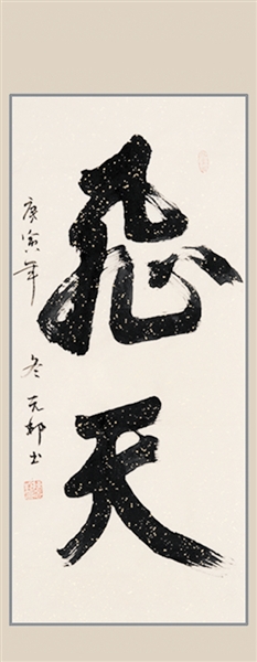 他的大字,如《海纳百川》、《真水无香》笔力遒劲,态致萧散,端庄杂流丽,刚健含婀娜。作品《飞天》则苍茫大气,一股横扫凌空的气势,用笔似拙实巧,格局气度在当代普遍秀弱的书风之下,实为难得。