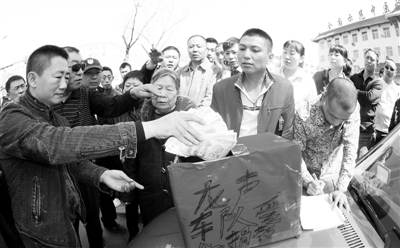 4月16日,哈尔滨出租车司机在医院为“的哥”张维宪捐款。4月15日16时许,黑龙江省哈尔滨市出租车司机张维宪突发脑溢血,因无法负担高额医疗费用,只能在医院走廊临时加床接受简单治疗。4月16日上午,张维宪所在车队队友得知情况后,自发来到医院为其捐款。目前,捐款数额已超过1万元。