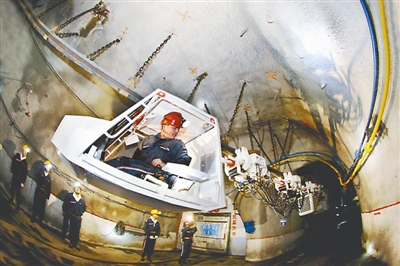 4月18日,在安徽淮北矿业集团袁店一井煤矿700米井下,技术人员在操纵单轨吊车机车作业。该单轨吊车专为在高瓦斯、有爆炸危险的煤矿采区设计,悬挂在井下巷道顶部单轨道上运行,可实现重型液压支架等重型物料远距离连续运输,一次可运送80人、吊重约30吨,创目前同型吊车之最。作业中设有工作、停车安全和超速及随车紧急制动等三套安全制动系统,有效降低了事故率,减轻了工人劳动强度,提高了工作效率。陈帮干 摄