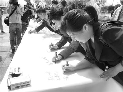 “经过800多天的日夜奋战,三年任务两年基本完成……”4月18日下午2时,为感恩上海对口援建,都江堰市总工会在该市快铁车站广场举办万名职工感恩签名活动启动仪式。据悉,签名长卷完成后,将送往上海“援建情·感恩心”活动现场展出,最后由上海市总工会代表该市广大职工永久保存。图为签名活动现场。本报记者 高柱 摄