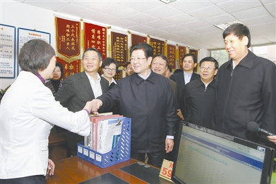 中共中央政治局委员、全国人大常委会副委员长、中华全国总工会主席王兆国4月14日至18日在贵州考察调研。图为王兆国考察贵州省总工会困难职工帮扶中心,了解职工诉求和帮扶工作情况。李枫 摄