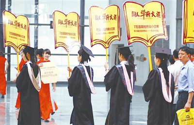 4月17日,2011年广西(南宁)房地产博览会上,一群女生身着学士服促销南宁某大学周边楼盘,这一独特的宣传方式吸引了众多目光。在国家房地产调控政策依然收紧和限购令出台情况下,各房产商纷纷出奇招吸引顾客。 刘万强 摄