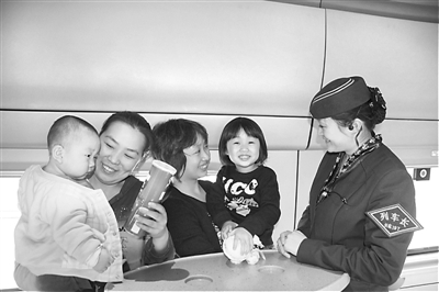 沈阳铁路局长春客运段的D23次列车,针对列车运行时间长、特殊旅客多等特点,为旅客提供了优质、周到的服务,赢得了旅客的赞扬。图为D23次列车长正在向第一次乘坐动车的小旅客介绍旅行常识。呼兴宝 摄