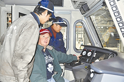 图为这个段大学生特色班组在德国技术专家指导下学习“和谐型”机车的新技能。田野 摄