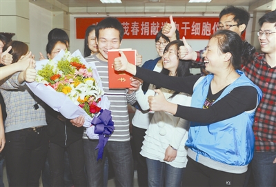 4月22日,面对同学们的赞扬,造血干细胞捐献者王茂春显得不好意思。当日,陕西长安大学环境科学与工程学院与中国造血干细胞捐献者陕西分库联合举行欢送王茂春同学捐献干细胞仪式。长安大学07级环境科学专业学生王茂春将捐献自己的造血干细胞,挽救上海一名身患白血病的年轻工程师。据悉,王茂春是133万名造血干细胞捐献者中唯一与患者配对成功的。