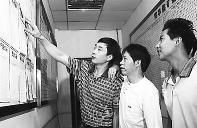 图为班组“劳模”王承刚在班组推行工资上墙公示制度。