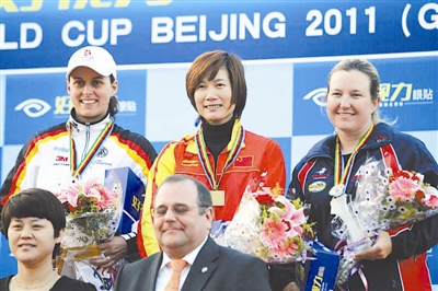 4月21日,中国选手魏宁(中)与美国选手罗德(右)、德国选手文策尔(左)在颁奖仪式上。当日,在国际射联射击世界杯赛北京站女子飞碟双向决赛中,魏宁以99中的成绩夺冠,并平了世界纪录。 新华社记者 李明 摄