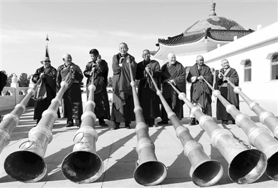 4月23日,宗教界人士在成吉思汗陵祭典上吹法器。来自内蒙古自治区蒙汉各族各界群众5万多人以蒙古族最高礼节祭奠“一代天骄”成吉思汗的陵寝。