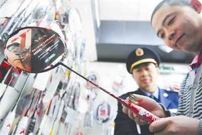 日前,北京海淀工商分局青龙桥工商所执法人员联合厂家打假人员,对北京体育大学周边文体用品批发市场进行突击检查。执法人员共检查体育用品商店19家,共有6家被查出销售假冒的yonex和adidas商品,当场查扣假冒的服装、鞋、球拍及球拍包等共54件,目前此案还在进一步调查中。欧阳晓菲 摄