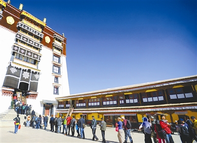 游客在布达拉宫排队参观(4月21日摄)。记者从西藏自治区旅游局获悉,2011年西藏旅游业发展的主要目标是:全年力争接待国内外游客突破800万人次;实现旅游总收入85亿元。