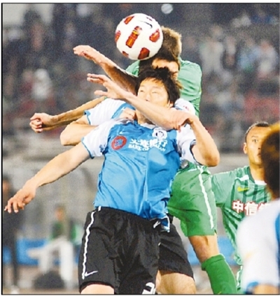 25日晚,2011赛季中超足球联赛进行了第4轮最后一场较量。北京国安在工人体育场以3比0战胜大连实德队。图为双方球员在大连队门前争顶头球。