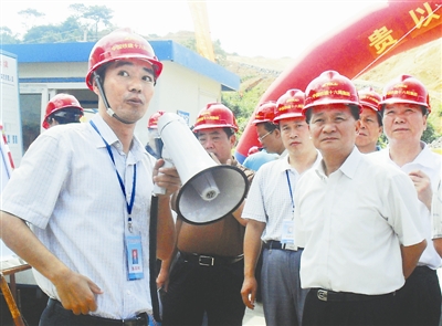 张国辉(左一)正在向广东省领导介绍现场施工情况