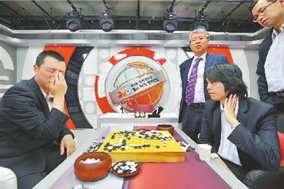 4月26日,中国棋手古力九段(左)与韩国棋手李世石九段在赛后复盘。 新华社发 (韩国棋院供图)