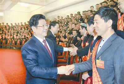 4月28日,庆祝“五一”国际劳动节大会在北京人民大会堂隆重举行。会前,王兆国、张德江等亲切会见了来自全国各行业的近200名劳模代表。本报记者 杨登峰 摄