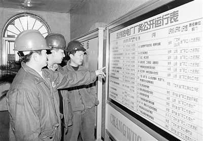 大庆油田电力集团宏伟热电厂员工正在观看该厂厂务公开栏,参与企业民主管理。朱明 摄