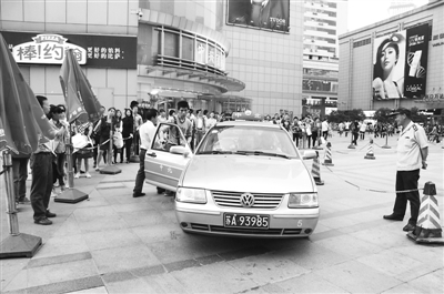 4月29日傍晚,南京市新街口大洋百货前打车的市民排起长队。