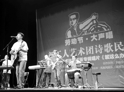 4月30日,新工人艺术团演员在演唱。当日,新工人艺术团在北京朝阳区文化馆举行“劳动节·大声唱——新工人艺术团诗歌民谣会”。新工人艺术团的前身是打工青年艺术团,是由在京打工者自发创办的社会公益性民间文艺团体。 新华社记者 罗晓光 摄