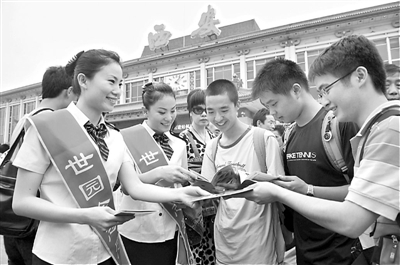 4月29日,铁路志愿者孪生姐妹张蓓、张蕾在西安火车站为旅客发放“乘火车游世园”宣传册。西安世园会开幕以来,铁路志愿者服务队分别在世园会主会场、火车站候车大厅、广场等处所,为旅客提供发放宣传册、代办世园会门票、回答旅客问询等服务,成为西安世园会期间一道亮丽的风景线。唐振江 摄