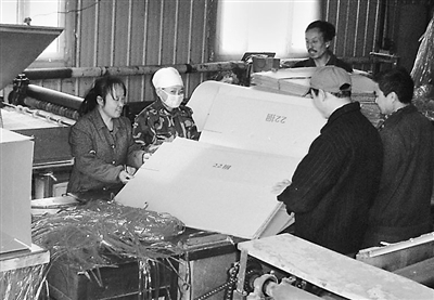 4月25日,桦祺生活用品公司的工人们正在加工纸箱板。黑龙江省八五二农场在深入持久开展“十大”民生工程的同时,大力支持发展民营企业,妥善安置下岗工人。