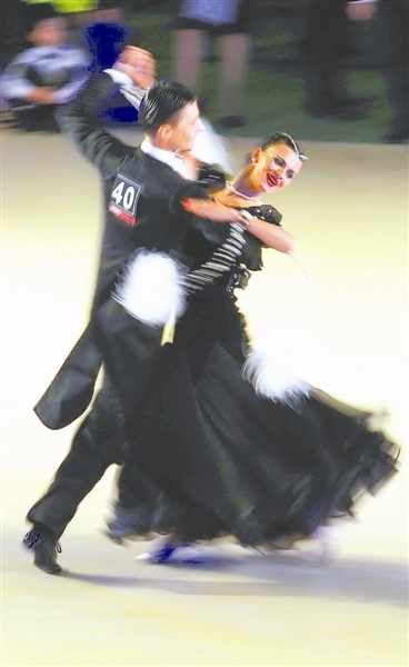 2011第三届世界体育舞蹈协会(中国)世界杯公开赛5月2日晚在北京光彩体育中心举行,来自20个国家和地区的1000多名选手参加了比赛。图为获得摩登舞冠军的意大利选手墨里耶尔·亚利山大和卡特琳娜。