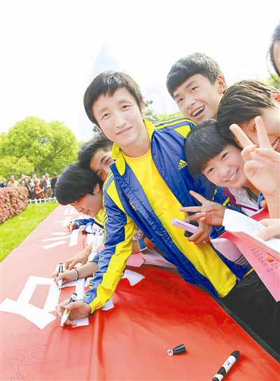 5月4日,在贵阳市举办的成人宣誓仪式上,奥运冠军、著名拳击运动员邹市明(中)现场与青少年们一起在条幅上签名。