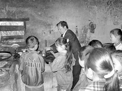 4月29日,全国劳动模范、江西省遂川县大汾镇小学教师陈清华在给学生分菜。